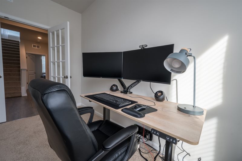 Office with French doors, dual monitors and adjustable desk- perfect for tele-working.
