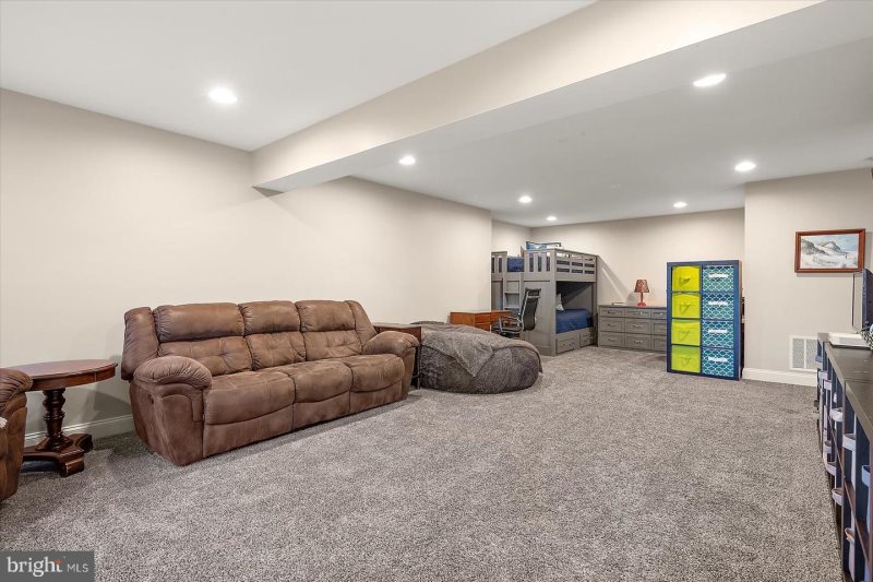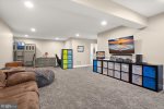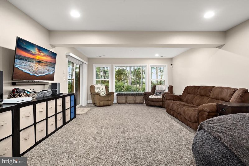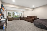 - The ground level offers a versatile recreation room perfect for movie nights, gaming, or additional sleeping space. Step outside to a covered patio with a linear gas fire pit, creating a cozy spot to unwind under the stars.