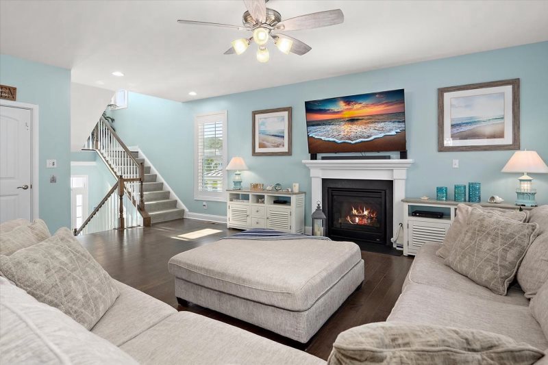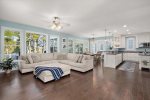 The main living level features a bright, open-concept layout with a gourmet kitchen, dining area, and living room—ideal for gathering after a day at the beach or pool.